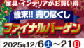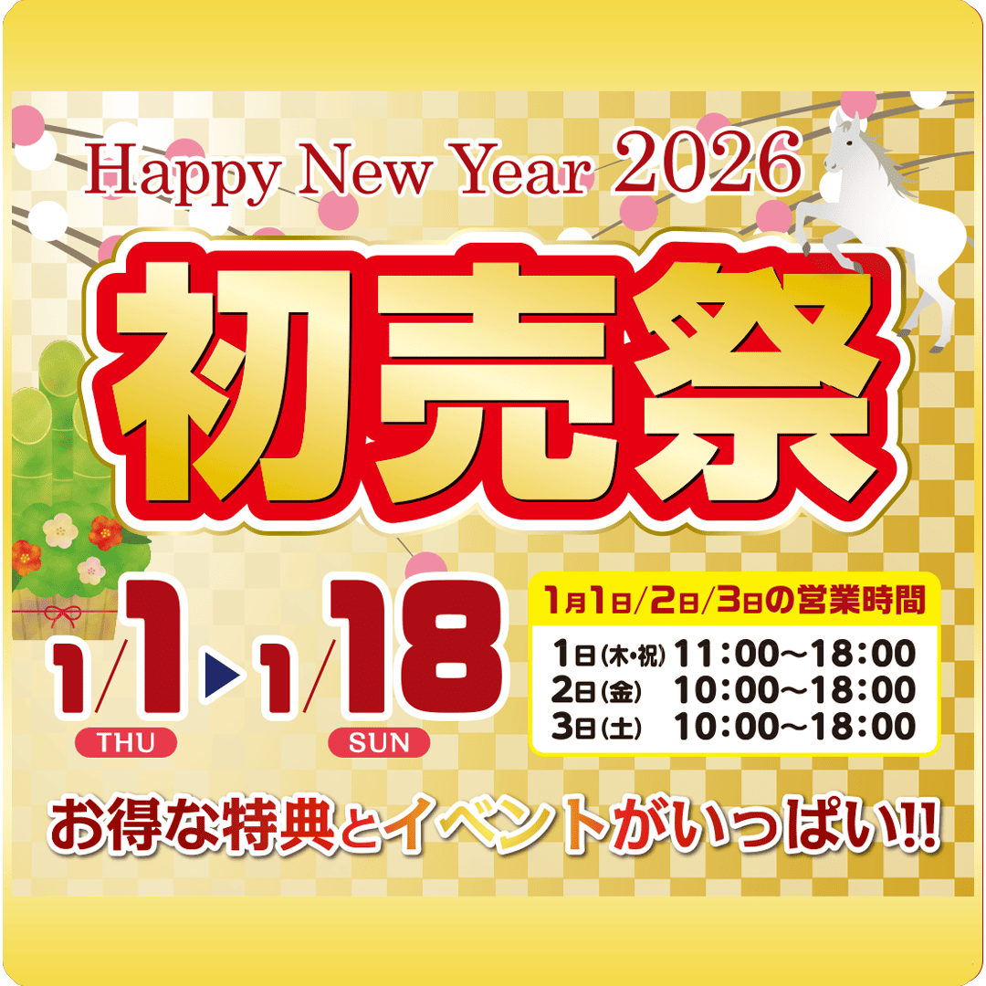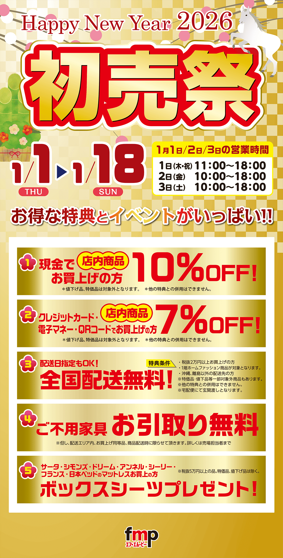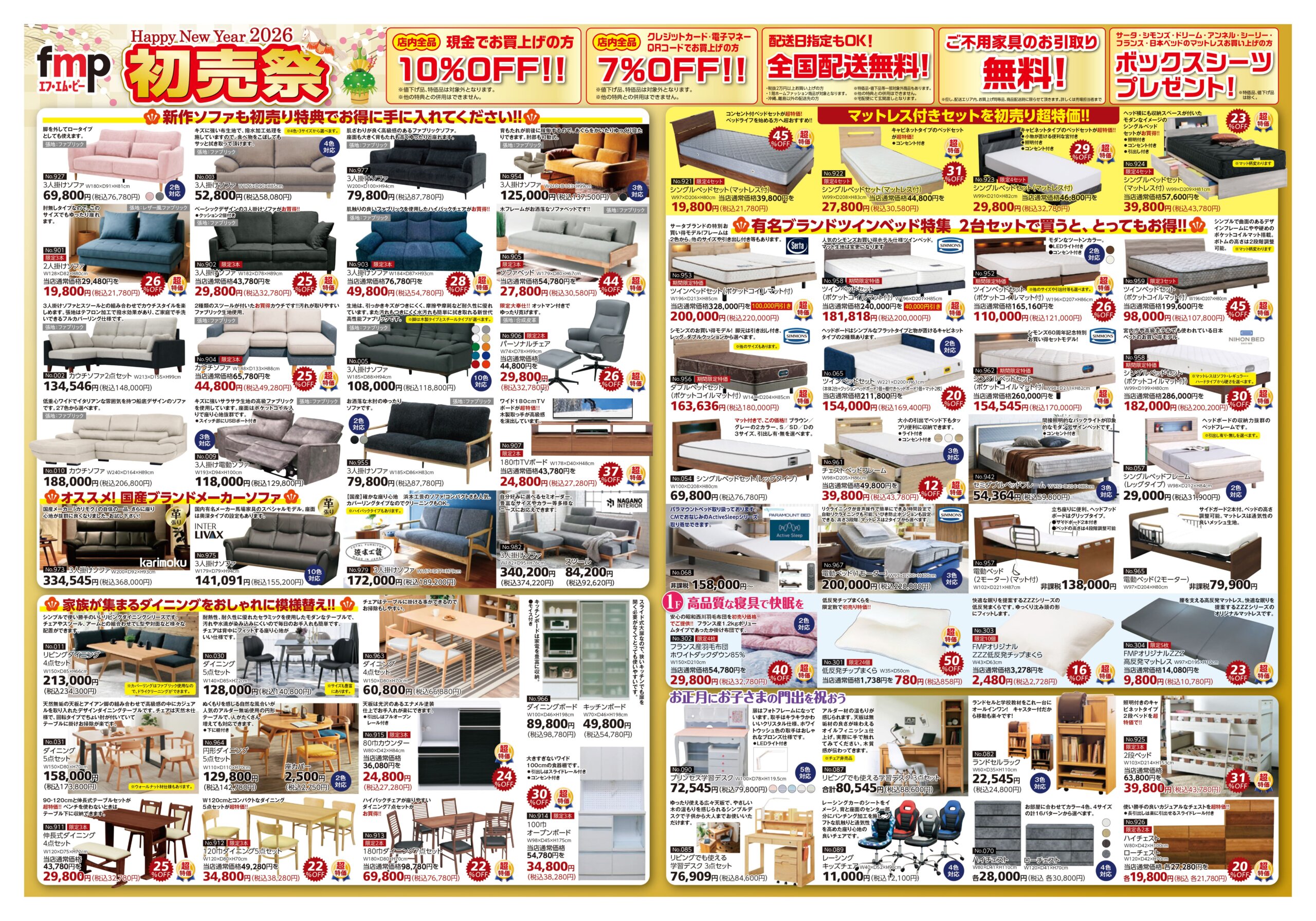 Happy New Year 2026!初売祭(1/1-18) SALE 2025.12.30 元旦11時より営業開始! fmpでは1/1(木)より「初売祭」を開催いたします。 欲しかったあの家具が、初売りならではの特別価格と豪華5大特典でお買い求めいただけます。 fmpの初売祭は特典とイベントがいっぱい! オモテ面 ウラ面 皆さまのご来店、お待ちしてます!!
